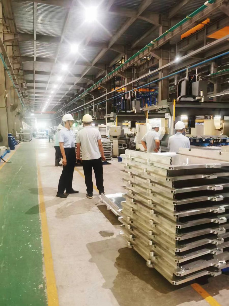 产线自动化智能化是实现高端转型的关键,为满足新能源汽车铝零部件“高精度、高效率”的要求,李智秉持“智能改造、数字转型”的企业发展战略,带着永葆锐意创新的勇气,敢为人先的锐气,夜以继日带领生产、技术、工艺、设备团队攻坚克难,大力开展装备升级技术改造,先后完成宜家自动下料锯、机器人涂胶工作站、机器人点底板、机器人焊横梁、家电边框通用刷纹机、电池托盘尾料锯、电池托盘红丹检测专机等设备的自动智能化升级改造,完成铝型材全自动清洗生产线、研发四轴联动加工系统、研发机器人涂胶工作站、机器人激光清洗工作站的研制,较大程度提升生产效率。其中:铝型材全自动清洗生产线的研发解决了型材单件在机加工后的清洁问题,清洁效率比人工清洁提高显著。同时,型材表面清洁度提高,大幅度改善后续焊接质量,减少气孔、焊渣、飞溅等焊接缺陷。研发四轴联动加工系统在门槛梁、防撞梁等多面体加工应用,工件一次装夹完成五面体的加工,效率比分布式加工工艺提高至少50%。